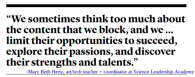- ...they can’t access the sites they want. Teacher’s say filtering is a major barrier to using the digital tools of our world because there is just so much they can’t access.